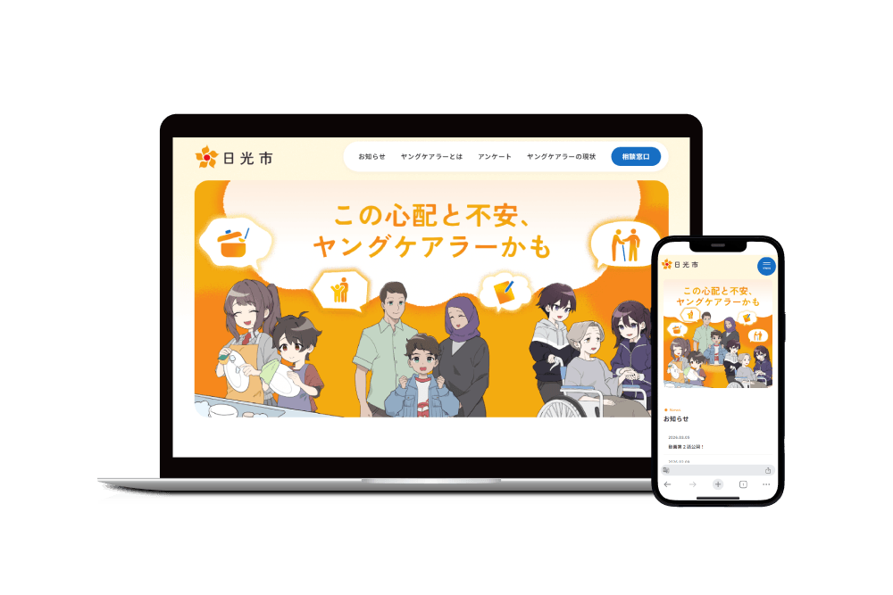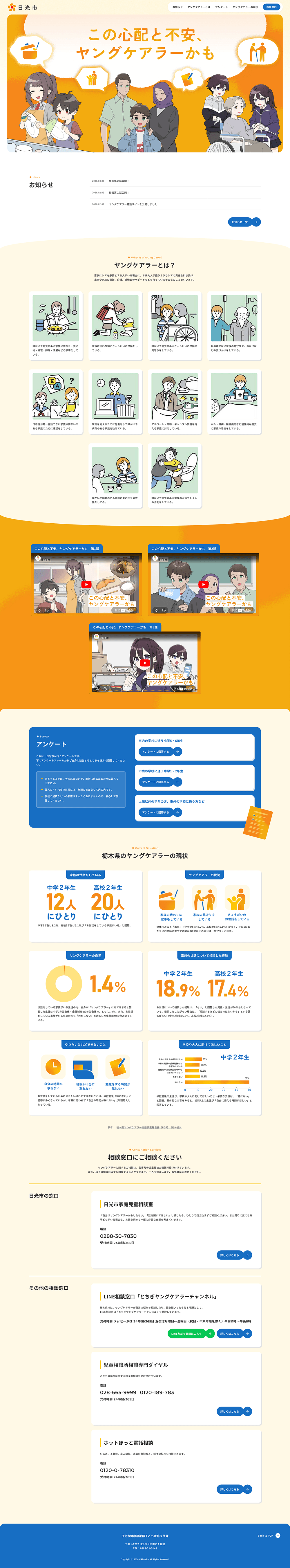 日光市のヤングケアラーを広く周知することを目的とした特設サイトを制作しました。デザインは「安心感」や「寄り添う姿勢」が伝わる印象を大切にし、オレンジやイエローを中心とした温かみのあるカラーパレットを採用しました。ボタンやアイコンなどあらゆるパーツに丸みを取り入れることで、優しさや親しみやすさを視覚的に表現しています。